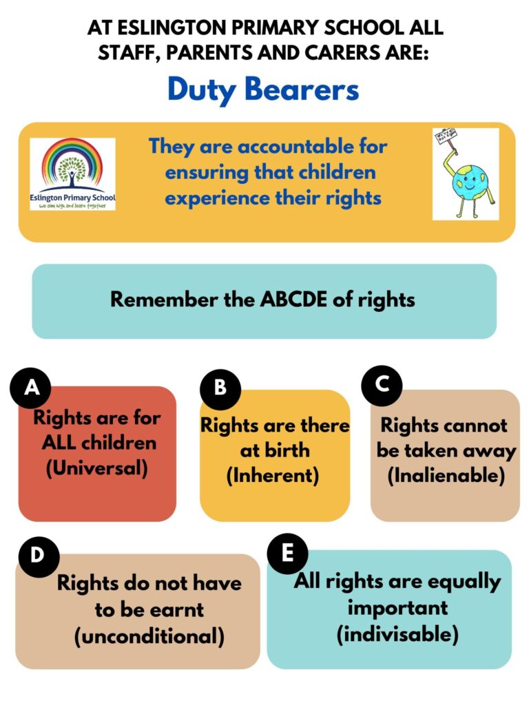 At Eslington Primary School both staff and children are passionate about upholding the rights of children. As duty bearers, the staff ensure that children’s rights are referenced in policies as they are updated and we regularly introduce key initiatives to focus on upholding the children’s rights.